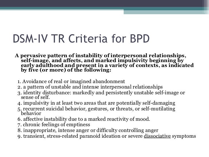 While other symptoms like intense emotions impulsively and intense relationships are often for life. DSM-IV-TR 2000 criteria for Borderline Personality Disorder.